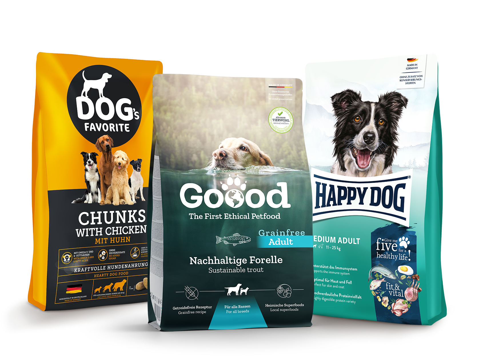 • Nachhaltiges und naturnahes Hundefutter von Goood, Vollnahrungsfutter von Dog's Favorite oder das ausgeprägte Sortiment von Happy Dog!